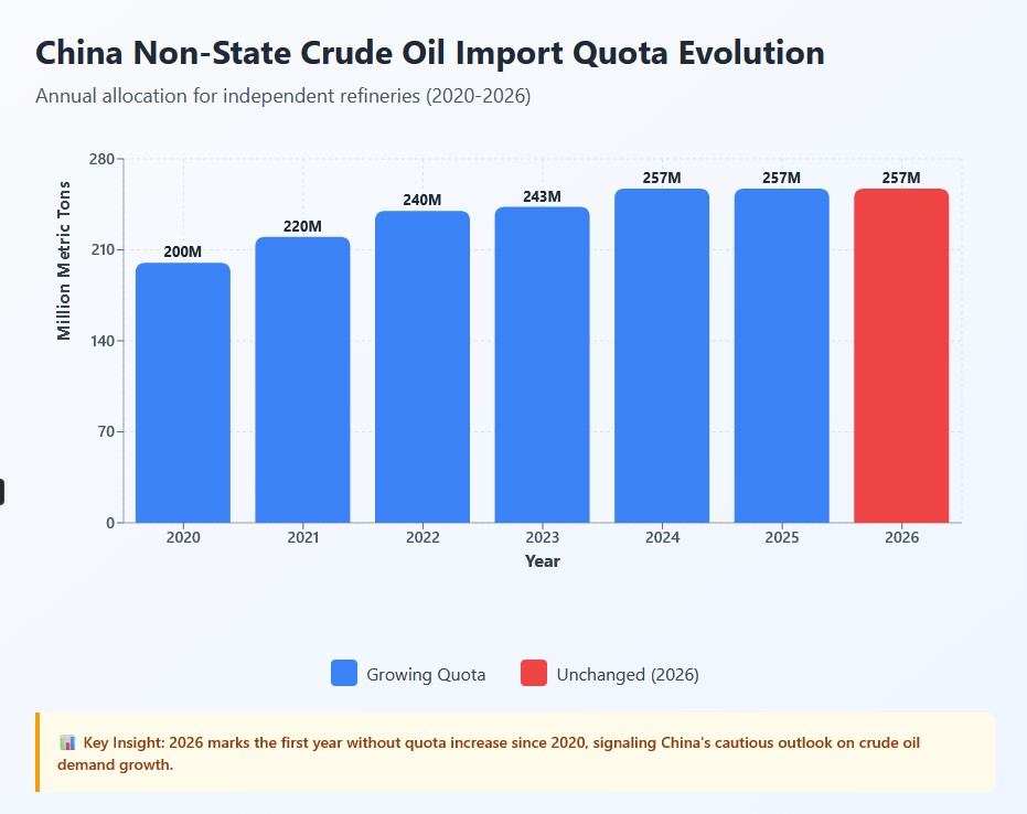 China's decision to maintain the 2026 crude oil import quota at 257 million metric tons reflects careful assessment of demand prospects amid ongoing economic and energy transitions. The unchanged allocation suggests authorities anticipate adequate supply availability while managing oversupply risks and supporting domestic refining sector consolidation.