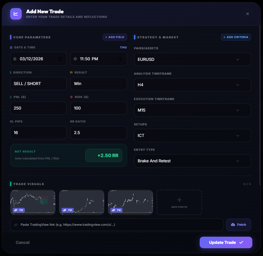 With these fields you can answer the core questions every trader must know: where you lose money, which setups are profitable, and when your edge is strongest.